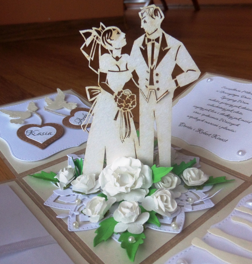 Tak się złożyło, że czasem i ja idę na ślub ;-) nadarzyła się okazja, żeby trochę poeksperymentować i w taki oto sposób powstał exploding box na bazie eko, z tekturkową Para Młodą na środku w towarzystwie wielu kwiatów! Chciałam też wypróbować, jak będzie się owy box prezentował w torebeczce. Muszę przyznać, że efekt końcowy bardzo mnie zadowolił, a boxa bardzo wygodnie się wręczało.